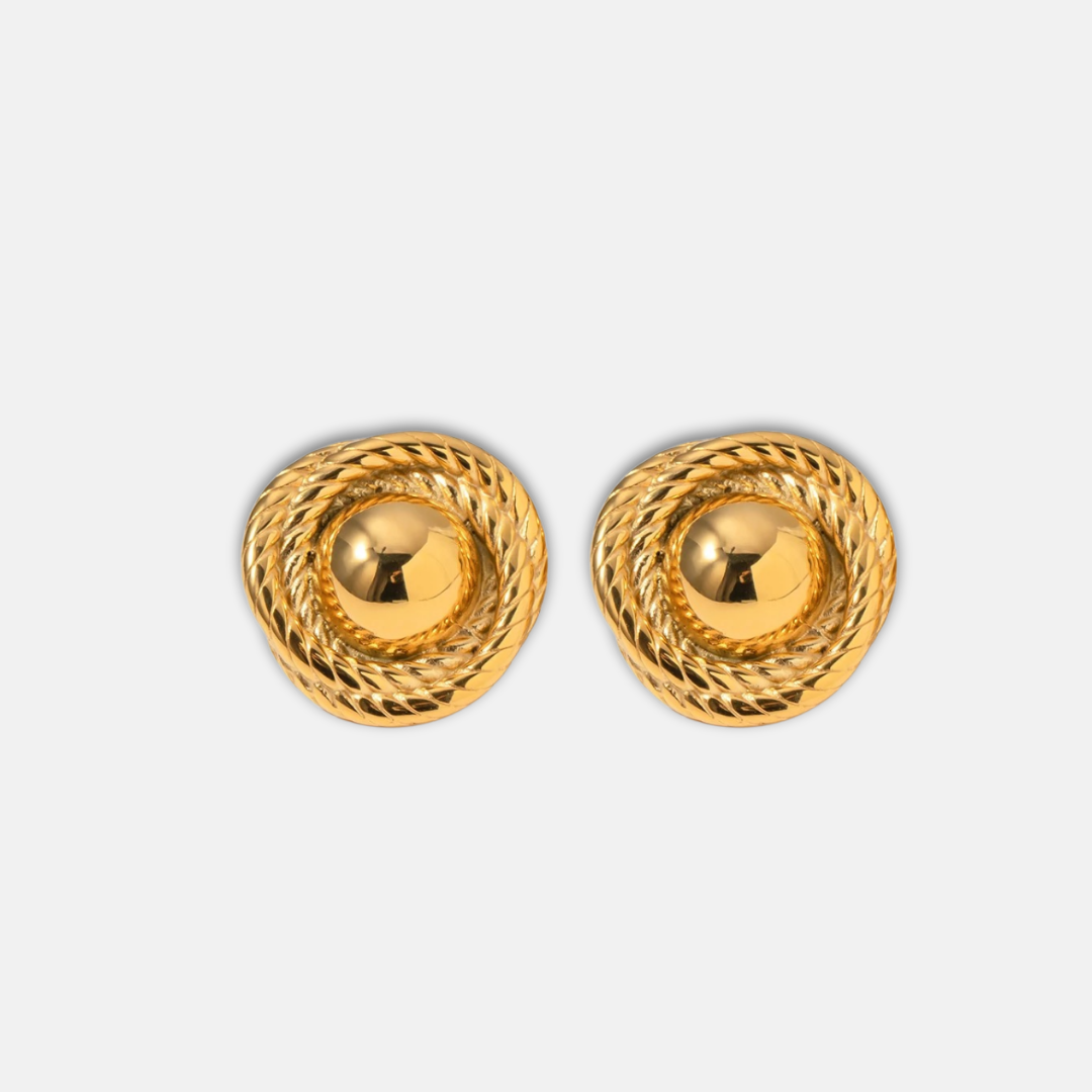 A 18K gold button shape design with rope texture. A statement staple that is chic and timeless that IT girls love to wear.